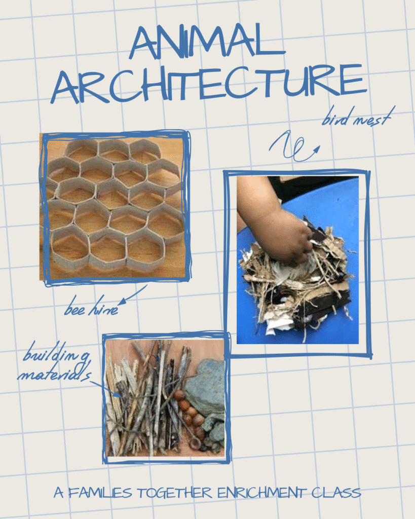 Welcome to Animal Architecture, where nature meets design! In this hands-on STEM enrichment class, children will explore the amazing homes animals and insects build—like bird nests, beehives, tunnels, and beaver dams. Through creative model-building and playful experiments, children will discover early math, science, and engineering concepts while learning how creatures in the wild design their perfect shelters. It’s a fun-filled journey of curiosity, creativity, and construction! Taught by Ann Gadzikowski and Kirsten Ruckdeschel.