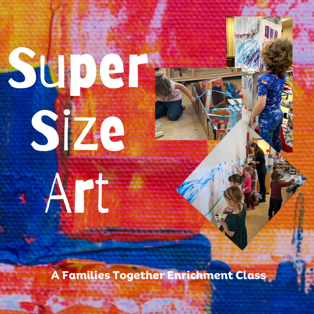 Super Size Art is a creative art class where children explore concepts of big, bigger, and biggest through hands-on projects. Children will experiment with relative size as they paint giant murals, build tall collaborative sculptures, and create art that’s larger than life. This class encourages teamwork, imagination, and joyful self-expression—on a super-sized scale! The class will be taught by Families Together Teachers Molly Roudebush and Jill Victorine.
